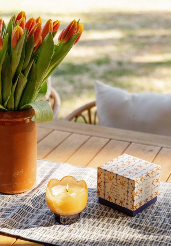 Earthy and vibrant, Garden & Grove evokes the richness of a flourishing vegetable garden warmed by the sun. The candle is poured into a yellow rust tulip-shaped vessel, bringing a rustic garden-inspired look to any room. When the candle has finished burning, the glass can be repurposed as a tea light holder, adding a cozy glow to your space.