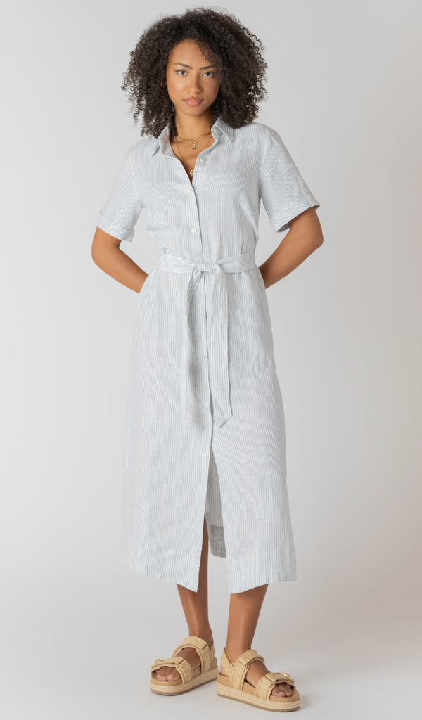 Room 34 Belted Shirt Dress White Blue Stripe