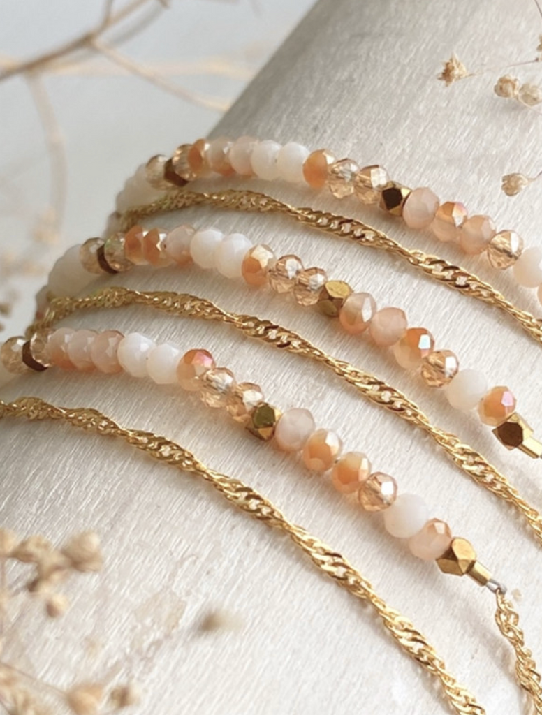 This unique, double wrap bracelet is hand beaded. The beaded centrepiece shimmers alongside the DNA chain that we absolutely adore. The bracelet is meant to wrap around the wrist twice.