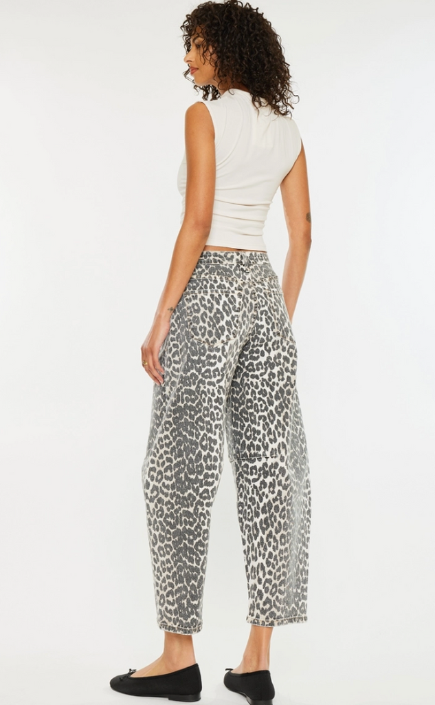 High rise leopard horseshoe jeans Beige wash Comfort stretch Back patch pocket Zip fly with button closure Balloon wide relaxed denim Non distressed Dart details Regular hem Rise 11" inseam 26.5" wb 1.5" in size 5/26 98% cotton, 2% spandex 14.06 oz